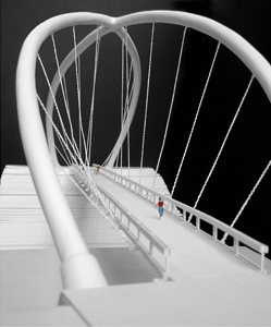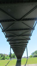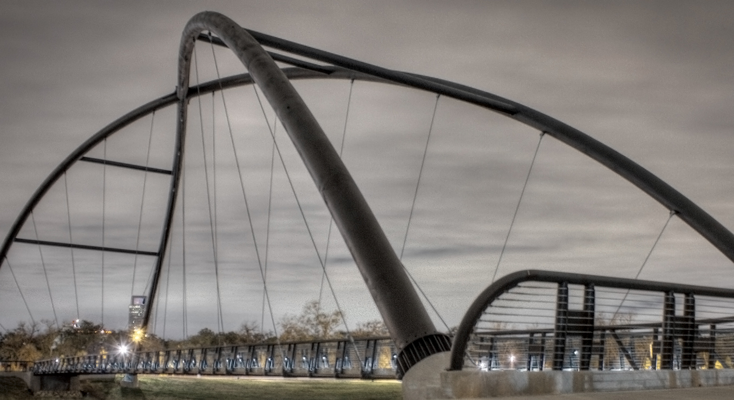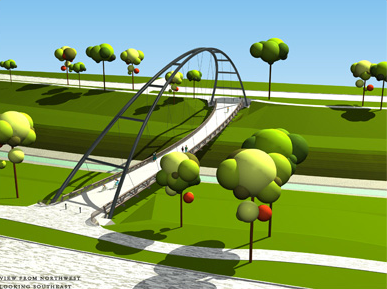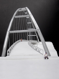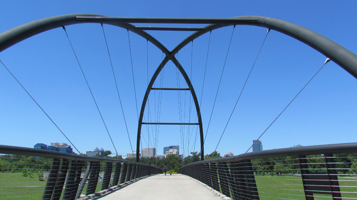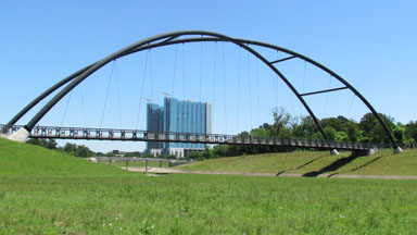 The bridge fulfills Hermann Park’s desire for connecting park lands separated by Brays Bayou. MC2 Architects prepared the initial concept for an ‘X’ design arch bridge. Architect Daria Conlan rotated the arches inward, creating inherent structural stability while retaining its conceptual elegance.