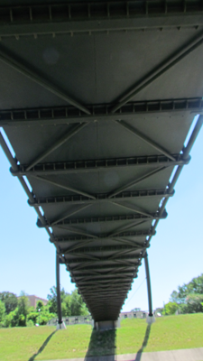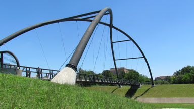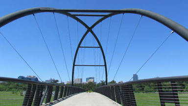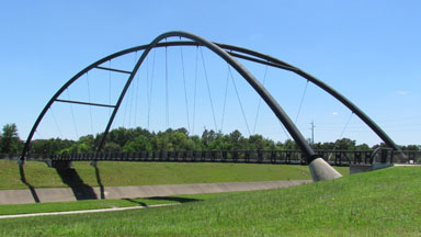 The Bill Coats Bikeway Bridge crosses Brays Bayou just east of the Hermann Park Golf Course. The bridge is 293 feet long, featuring intersecting steel arches with a suspended deck. Attorney Bill Coats (1940 - 2010) was a champion of Houston bikeways, parks, and green space.