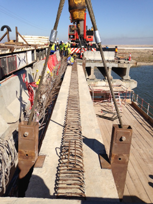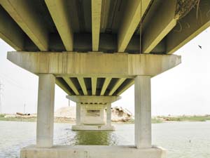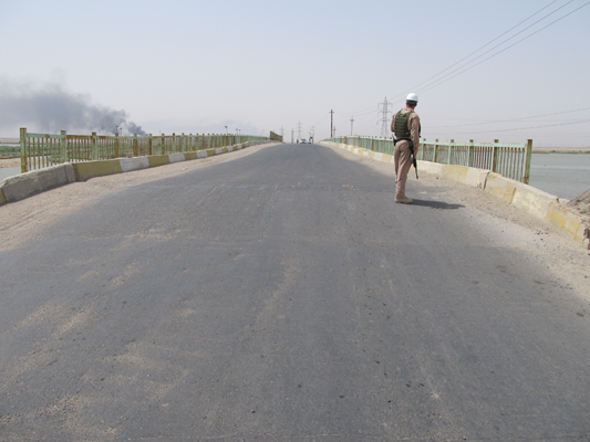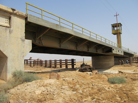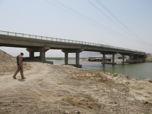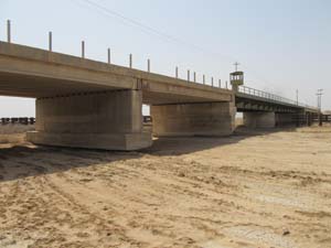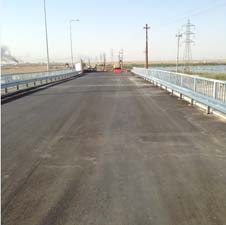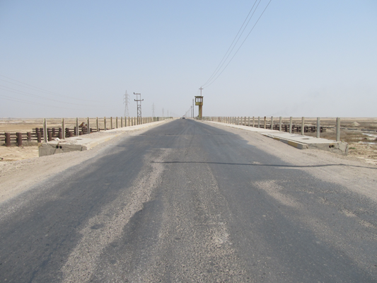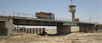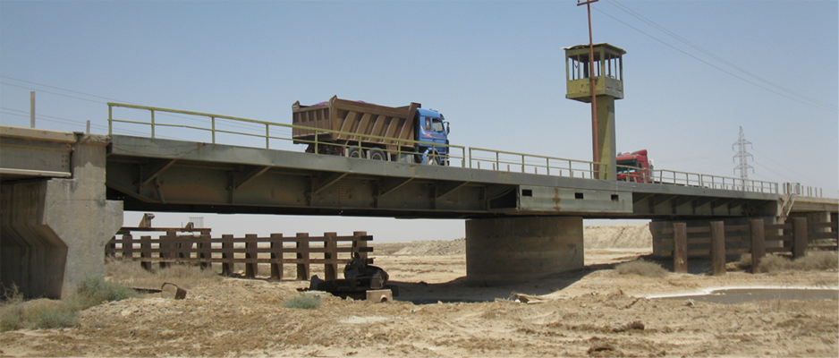 The Third River is a canal with locks, designed for barge transportation, and to drain surrounding marshlands, enabling development of massive oilfields. There are few road crossings of the Third River. Bridge K44 is 44 km from the locks; approximately 40 km west of the nearest crossing, in Basra. Bridge K44 has 4 mild reinforced approach spans of 16.5m each, and 2 prestressed main spans of 33m each.