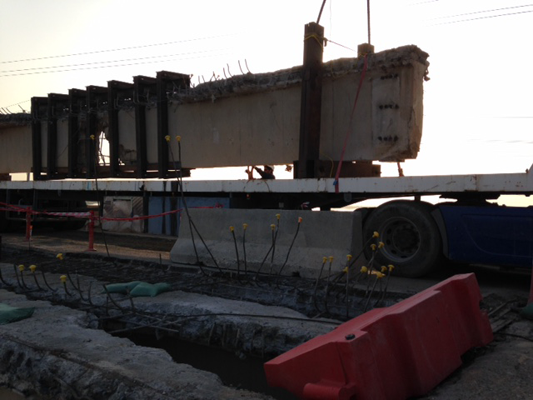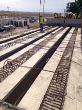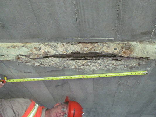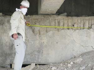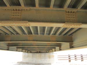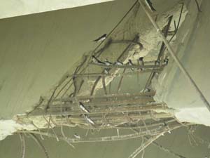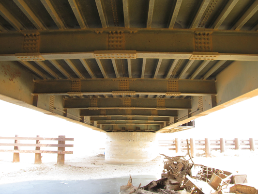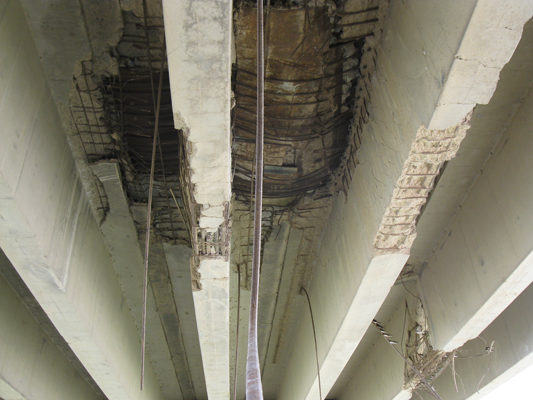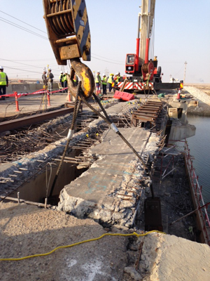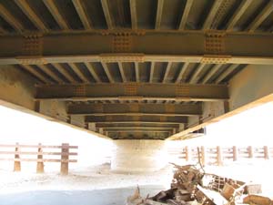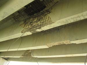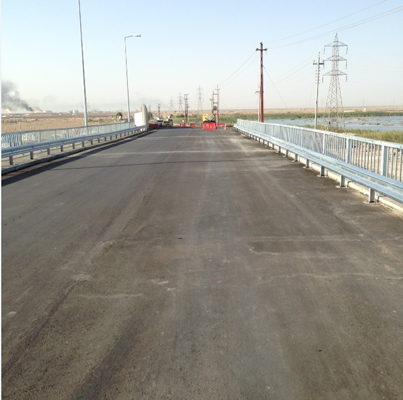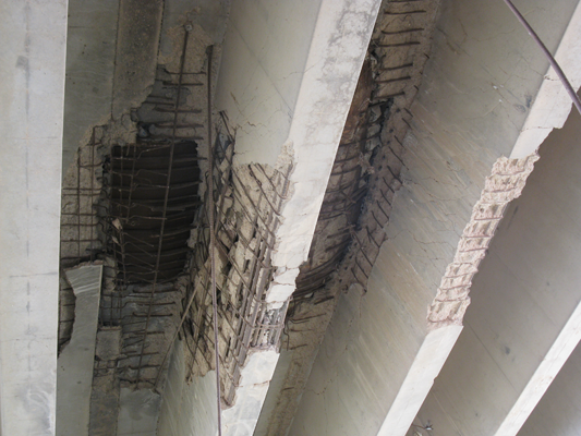 We found massive damage to span 2 from the south. The center two spans consist of prestressed beams; in very good condition, with minor damaged to deck and rails. The north 2, and south 2 spans are mild reinforced; the north 2 spans had recently been replaced, utilizing timber forms on temporary fill. Substantial honeycombs existed in soffit of a few of these beams, enabling visual verification of profometer reinforcing measurements. The south span had 4 original and 3 replacement beams; the replacement beams apparently installed following the first gulf war. Span 2 from south consisted of 7 original beams; beams 4, 5 and 6 had severe damage, with related large holes through the deck. Replacement plans for the beams had been started, we reviewed those plans and incorporated them into complete plans, specifications, and estimates for the bridge. The bridge has since been fully repaired.