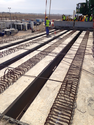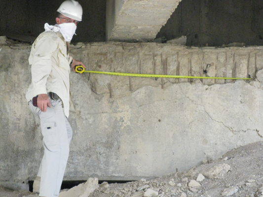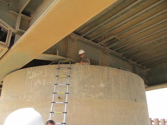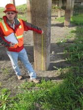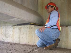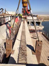 The swing bridge consists of 7 spans; 3 simple prestressed concrete beam spans, 2 span continuous steel girder swing unit, and 2 simple prestressed concrete beam spans. We carefully measured each element of the steel girder unit. We field measured the sections of prestressed beams, and used a profometer to determine prestressing strands and mild shear reinforcement. We verified shear reinforcement in areas with spalls. We verified prestressing strands by inspecting a nearby (abandoned) beam fabrication yard. We inspected rejected (broken) beams of identical section and length, obtaining detailed verification of our bridge inventory findings. We also obtained steel samples for further testing, if needed.